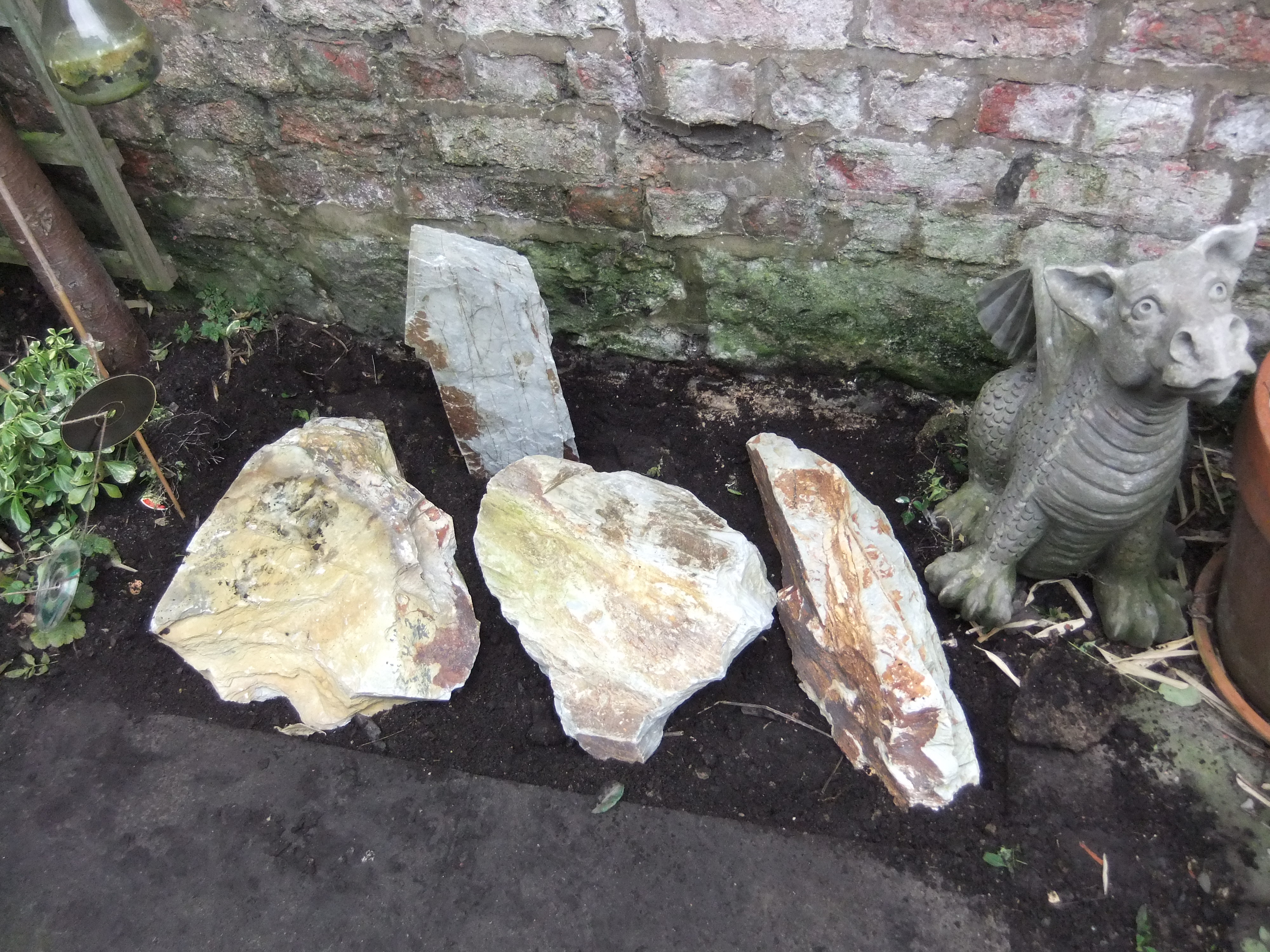 Si came up with the idea of creating a low rockery. He was thinking that; stone meant less soil for moggy digging, it gave structure to the bed and gave us channels to plant in. You know what he was right...