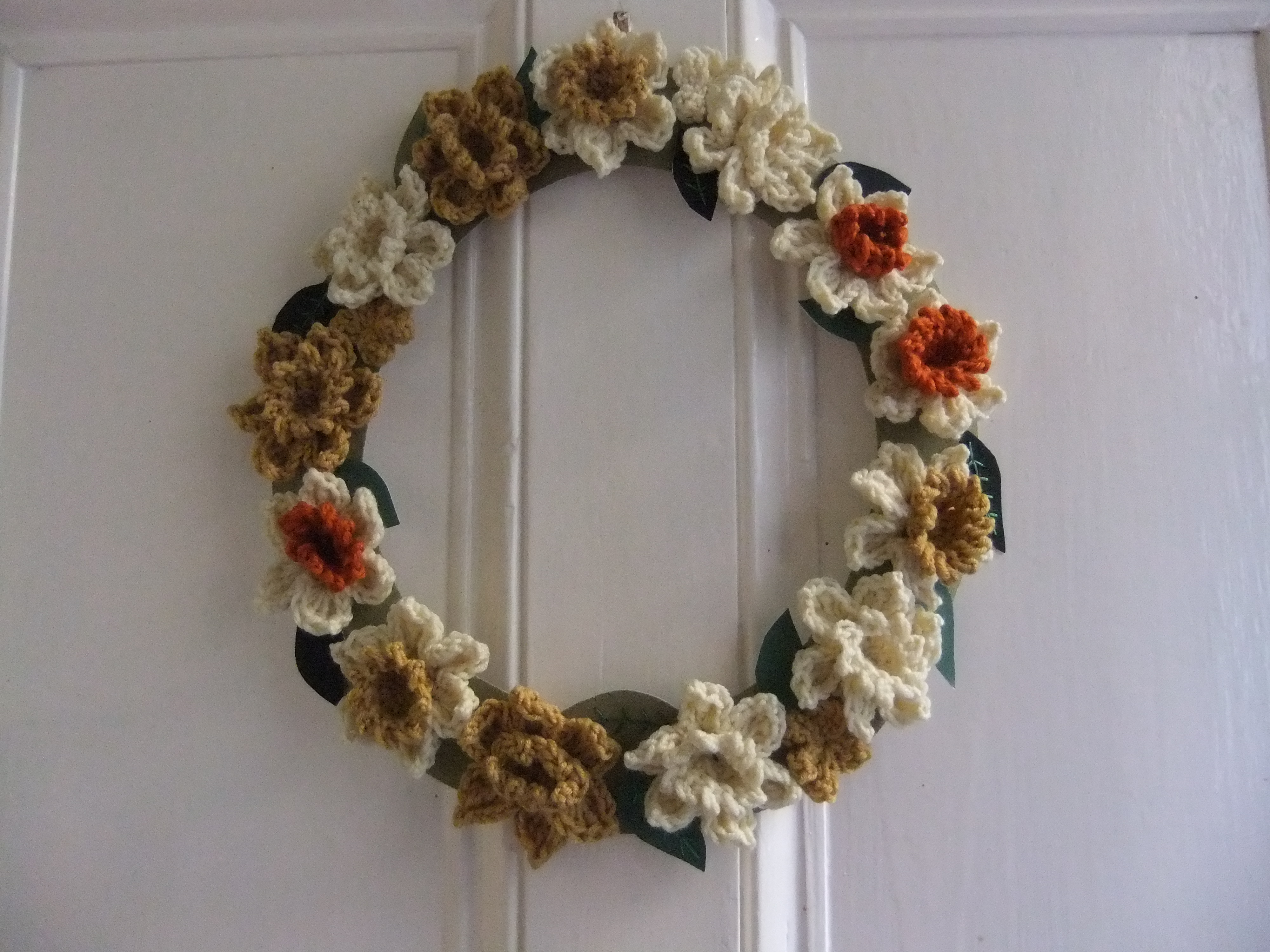 I stitched the Daffodils to a base made of green material and then filled in any gaps with small crocheted Primroses and leaves. I am really happy with how this turned out, I think that is will be a Springtime wreath, rather than just an Easter wreath.