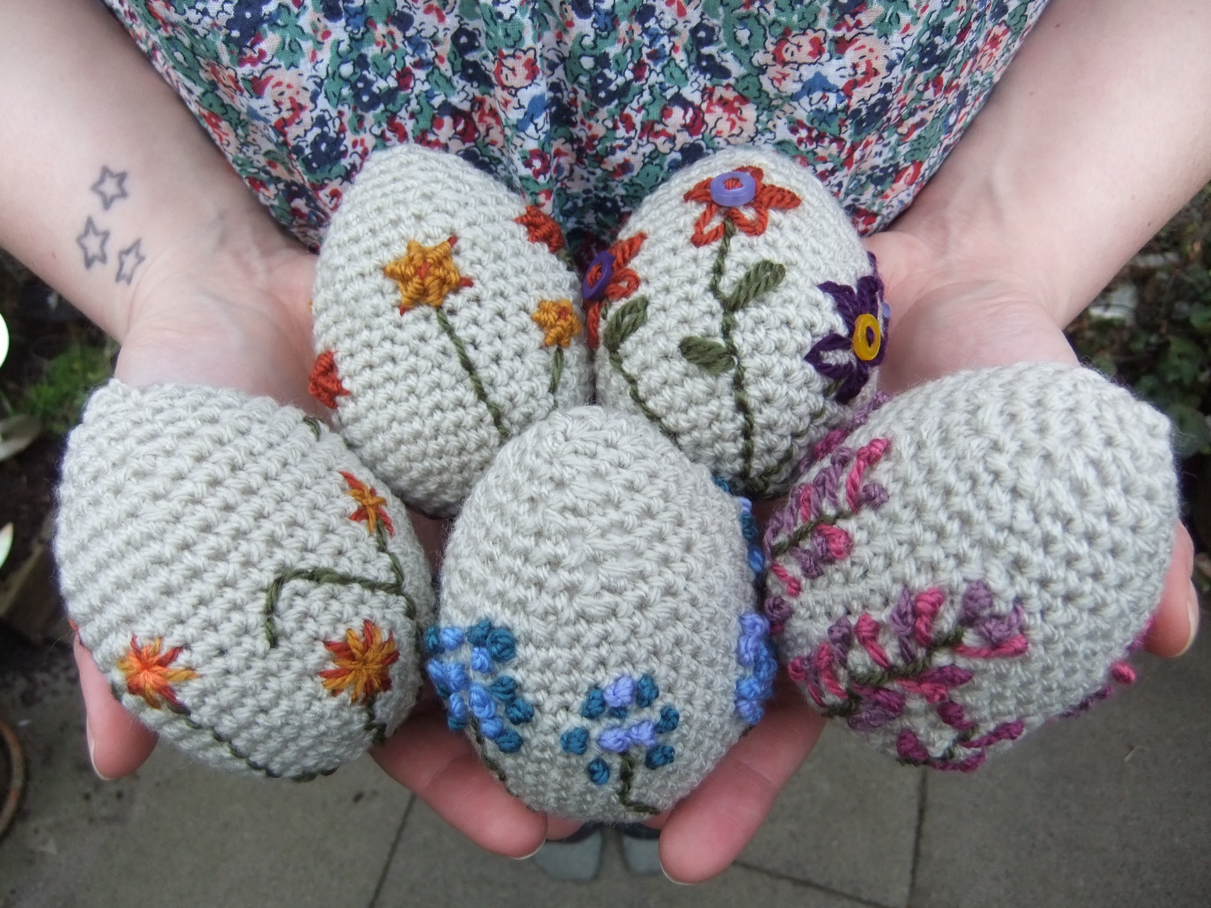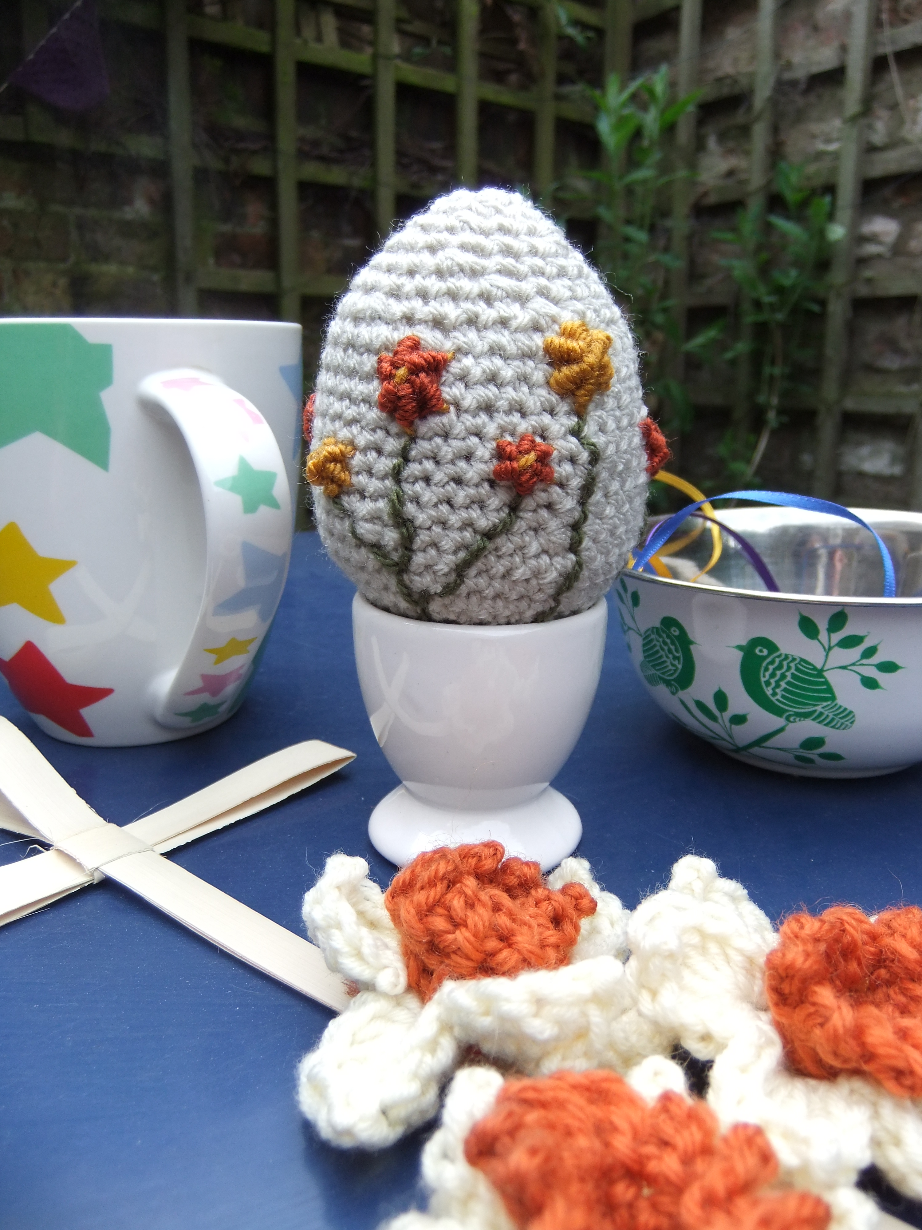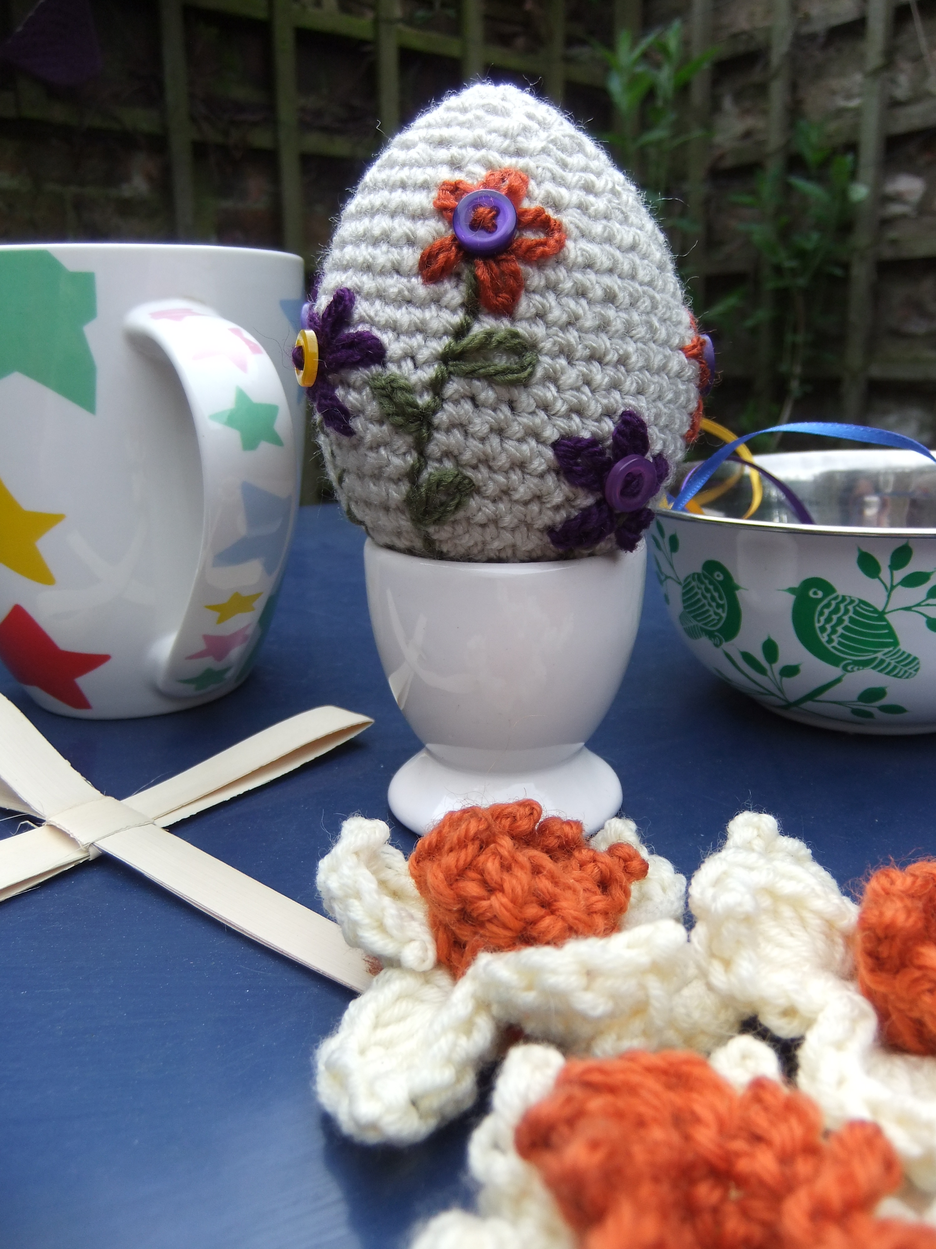 Happy Easter to you all! I really hope that you have a lovely long weekend, enjoy the sunshine and see the opportunities for new beginnings. Do you remember a few weeks ago, when I was preparing my Easter crochet project, and I didn’t quite know what to do? Well, inspiration hit: and I ended up combining two of my favourite crafts – crochet and embroidery. I am very new to embroidery; I have dabbled in it a little and been to a couple of classes, but as yet I haven’t really found my way of doing it. I think that this may be about to change. I know myself and know there is little point in aiming for fine embroidery, maybe one day…but not yet. For me it needs to be slightly more instant, that’s way I love crochet – that instant hit. Somehow combining crochet and embroidery, seemed less daunting and more natural, and I can’t tell you how happy I am with the result. I hope you know that very special feeling that you get (occasionally) when you are soooo pleased with what you have made – it actually makes you glow? Glow: without being smug, because you know the amount of projects you are less pleased with greatly out-numbers the ones you love. That is how I feel about my Easter crochet. Are you ready? Ta-dah…